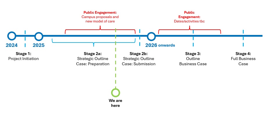 We are reviewing the best way of doing this by exploring a series of options in a ‘Strategic Outline Case’ (see timeline below), which we are developing with health and care partners, patients, staff and community stakeholders.